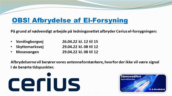 I forbindelse med eftersyn, kan der være korte perioder i dagtimerne, med afbrydelser af vores tv og bredbåndssignal. Arbejdet starter mand...